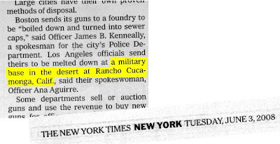 But a secret gun-smashing military base in Rancho Cucamonga? That's a new one on us. Or maybe that explains that weird tract at the southeast corner of Baseline (16th Street there) and Campus with the high berm walls and the huge power lines and where no roads go. We bet that's it. Although it's probably technically Upland.